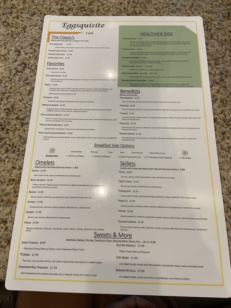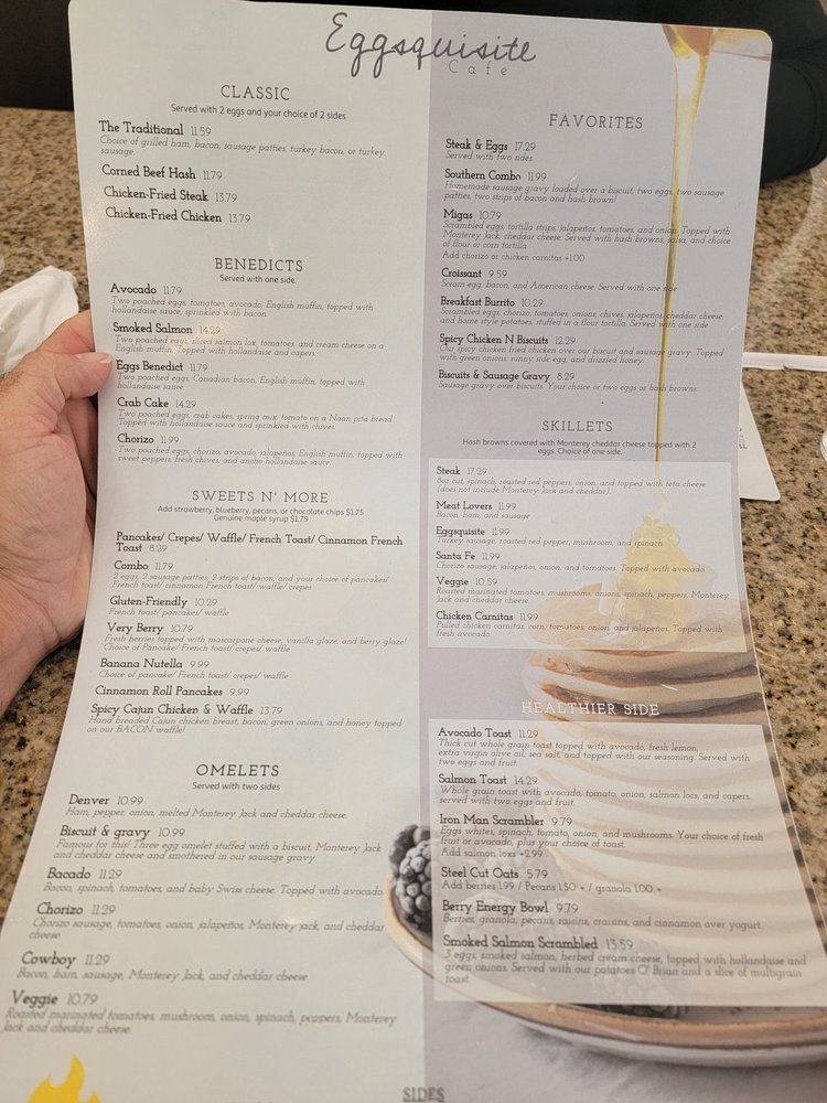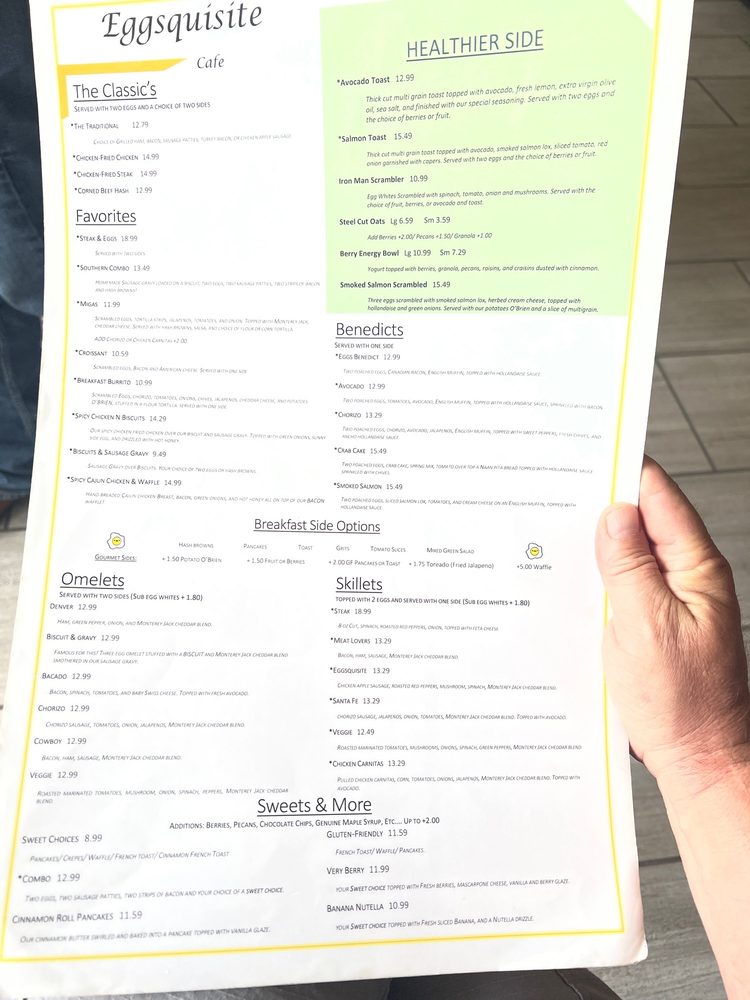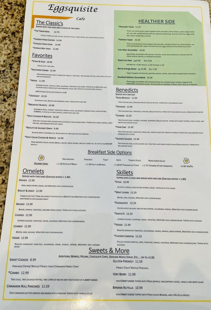 Introducing Eggsquisite Cafe, a trendy and casual creperie in McKinney, TX, offering a diverse menu perfect for breakfast, brunch, or lunch. With options like Avocado Benedict, Chorizo Benedict, and Crab Cake Benedict, Eggsquisite Cafe serves up unique twists on classic dishes. The California Burger, Cheeseburger, Patty Melt, and Whiskey BBQ Burger are burger options that will satisfy any craving. If classic dishes are more your style, try the Chicken Fried Chicken, Chicken Fried Steak, Corned Beef Hash, or The Traditional breakfast choices. Customers rave about the fast service, fresh and delicious food, and excellent ambiance. With a variety of options for vegetarians, vegans, and meat lovers alike, Eggsquisite Cafe provides a welcoming dining experience for all.