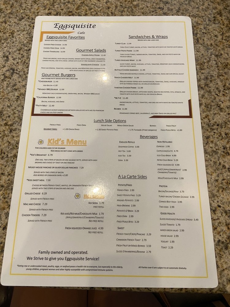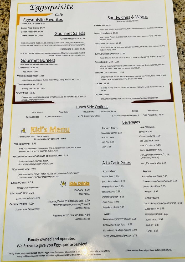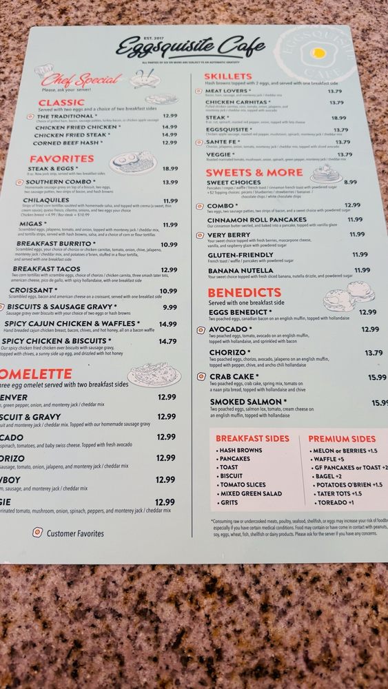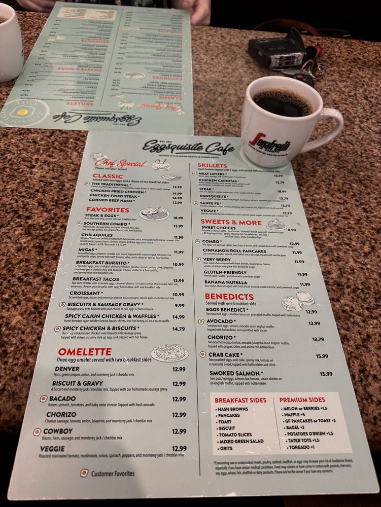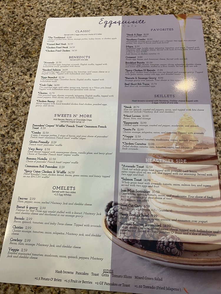 Introducing Eggsquisite Cafe, a trendy and casual creperie in McKinney, TX, offering a diverse menu perfect for breakfast, brunch, or lunch. With options like Avocado Benedict, Chorizo Benedict, and Crab Cake Benedict, Eggsquisite Cafe serves up unique twists on classic dishes. The California Burger, Cheeseburger, Patty Melt, and Whiskey BBQ Burger are burger options that will satisfy any craving. If classic dishes are more your style, try the Chicken Fried Chicken, Chicken Fried Steak, Corned Beef Hash, or The Traditional breakfast choices. Customers rave about the fast service, fresh and delicious food, and excellent ambiance. With a variety of options for vegetarians, vegans, and meat lovers alike, Eggsquisite Cafe provides a welcoming dining experience for all.