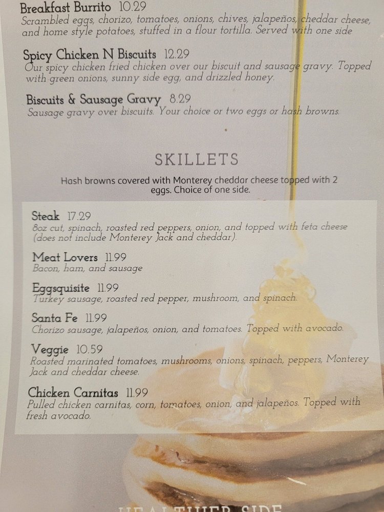 Scrambled eggs, chorizo, tomatoes, onions, chives, jalapeos, cheddar cheese, and hash browns, stuffed in a flour tortilla. Served with hash brown, grits, or fruit.